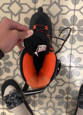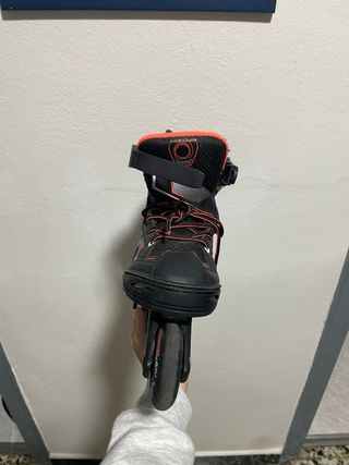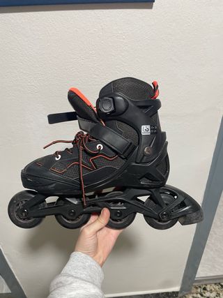 Patines en línea Oxelo en color negro con detalles en naranja. NUEVOS - Talla: 35-38 (22-24 cm) - Cierre con cordones, velcro y carraca. - Ruedas de 76mm.