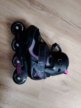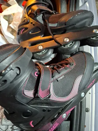 Patines en línea Oxelo en color negro con detalles en rosa, perfectos para iniciarse. Número de pie 41 incluye bolsa y protecciones de brazos y piernas - Diseño moderno y funcional. - Cierre de velcro y hebilla para un ajuste seguro. - Ruedas resistentes para un deslizamiento suave.