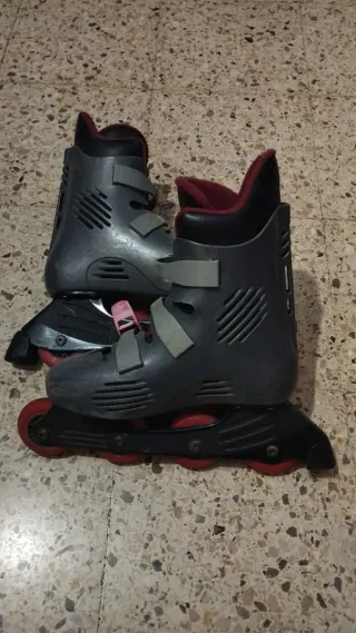 Patines en línea ajustables para tallas 35 a 37. Perfectos para iniciarse en el patinaje. - Diseño en negro y rojo. - Cierre de velcro , hebilla y cordones. - Ruedas de 80mm. Pequeñas rozaduras en el lateral Regalo protecciónes.
