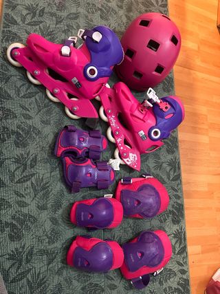 Set de patines en línea y protecciones para niños. - Patines en color rosa y morado, talla 32-34. - Incluye casco rosa. - Juego de protecciones para rodillas y codos en rosa y morado.