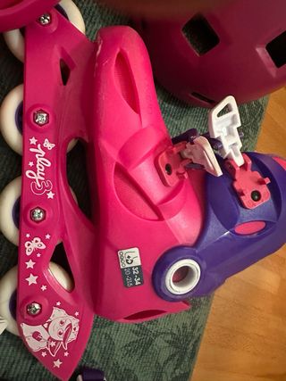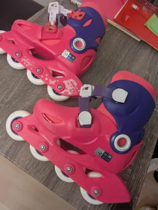 Patines en línea de color rosa y azul para niños. - Talla ajustable de 28 a 30 (equivalente a 18-19). - Diseño con estrellas y mariposas. - Cierre de velcro y hebilla.