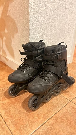 Patines en línea Oxelo en color negro, talla 44. - Cierre con velcro y hebilla. - Ruedas de 80mm. - Freno en uno de los patines.