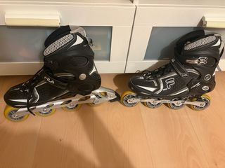 Patines en línea de la marca Fila, con un diseño deportivo en colores negro y rojo. -talla 42 - Ruedas de alta calidad. - Cierre de seguridad. - Diseño ergonómico.