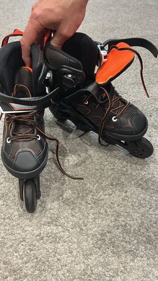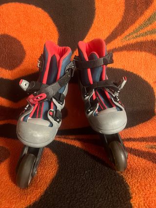 Patines en línea Oxelo para niños, talla ajustable de 32 a 35. Se encuentran en excelente estado, casi nuevos. - Color negro con detalles naranjas. - Cierre de velcro y hebilla. - Ruedas de 80mm y rodamientos ABEC 3.