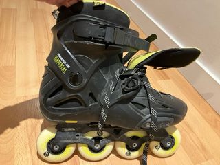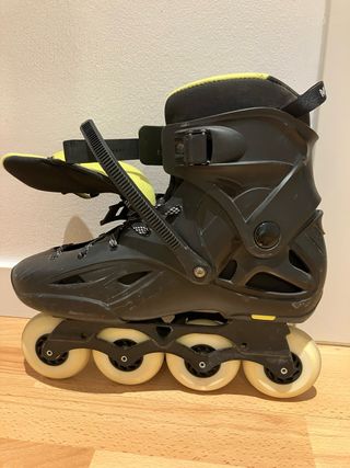 Patines en línea negros para hombre, con detalles en amarillo. - Cierre de velcro y hebilla. - Ruedas de poliuretano.