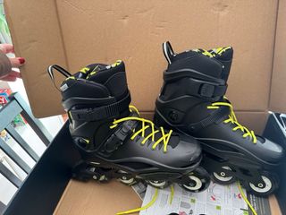 Patines en línea Rollerblade RB 80 en color negro con detalles en amarillo neón talla 42. Diseñados para patinaje recreativo y crucero. - Ruedas de 80mm. - Cierre de velcro y hebilla. - Bota alta para soporte. - Cordones amarillos brillantes. Con su caja original, solo tiene 2 usos.