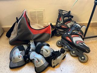 Set de patines en línea marca Rollerblade, ideal para disfrutar del patinaje. Talla 40. - Incluye funda de transporte. - Incluye juego completo de protecciones (rodilleras, coderas y muñequeras). - Diseño en color gris, negro y rojo.