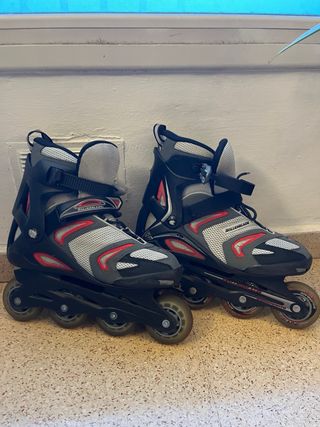 vendo patines en linea talla 41. En perfecto estado. usados muy poco. incluye protecciones de rosillas, codos y manos - Cierre con cordones rojos. - Ruedas rojas. - Diseño deportivo.