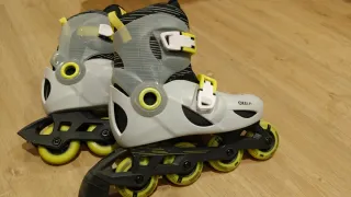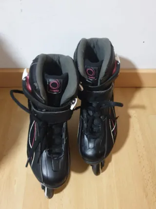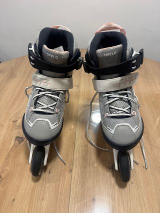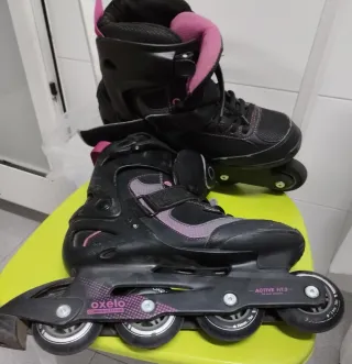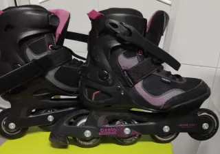 Se venden patines en línea Oxelo en color negro, rosa y verde menta. Son cómodos y resistentes. - Cierre con cordones, velcro y hebilla. - Ruedas de poliuretano. - Chasis de aluminio.