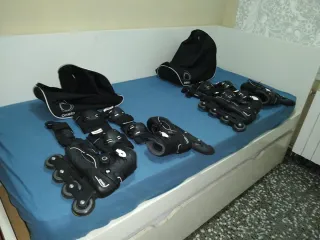 Set de patines en línea Oxelo de color negro, ideal para disfrutar del patinaje. Incluye equipo de protección. - Patines en línea negros. - Juego de protecciones (muñequeras, coderas y rodilleras). - Bolsa de transporte negra. Dispongo de dos juegos: Talla 39,5 y 42,5. Tienen pequeñas marcas debido al uso pero se pueden utilizar perfectamente. Kit de inicio en buen estado Recogida en persona. Hospitalet de Llobregat Precio: 35 € cada juego!!!