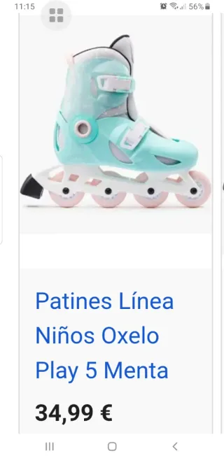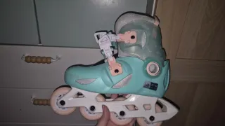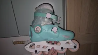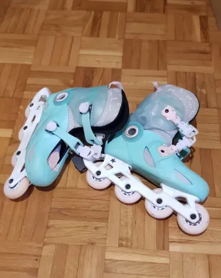 Poco uso. Patines en línea Oxelo Play 5 en color menta, ideales para niños. Se ajustan a las tallas 32 a 34. - Diseño moderno y cómodo. - Cierre con velcro y hebilla para un ajuste seguro. - Ruedas de calidad para un deslizamiento suave.