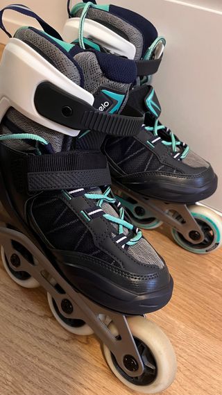 Patines en línea marca Oxelo de Decathlon, talla 38. Diseñados para ofrecer comodidad y buen deslizamiento. - Color principal negro con detalles en turquesa y gris. - Cierre con cordones, velcro y hebilla. - Ruedas de poliuretano. Tienen una salida solamente. Lo puedes ver en las ruedas y en que no tienen absolutamente nada de suciesad ni desperfecto.