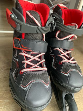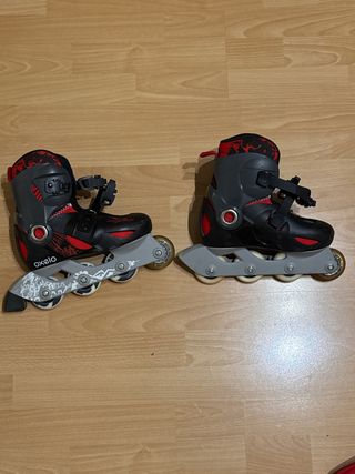 Patines en línea Oxelo para niño, ideales para iniciarse en el patinaje. Patines en línea en muy buen estado casi sin estrenar. Talla 32-34 - Diseño en negro y rojo. - Cierre con velcro y hebilla. - Ruedas de poliuretano. - Luces en la rueda delantera.