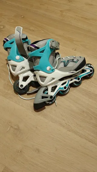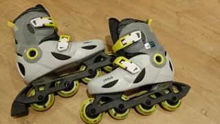Patines en línea de la marca Oxelo, talla 32-35. Diseñados para patinaje recreativo. - Color gris y turquesa. - Cierre con velcro y hebilla. - Ruedas de 80mm. Muy poco uso, algún rasguño pero en perfecto estado