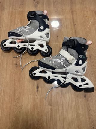 Se venden patines en línea talla 38, perfectos para iniciarse o para patinadores intermedios. Incluyen muñequeras de protección y una bolsa para transportarlos cómodamente. - Talla 38. - Color gris y blanco. - Cierre de velcro y hebilla. - Incluye muñequeras. - Incluye bolsa de transporte.