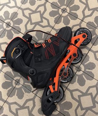 Patines en línea en color negro con detalles naranjas. Perfectos para desplazarse y disfrutar. - Cierre con velcro y cordones. - Ruedas Oxelo.