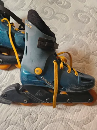 Patines en línea Stardablade con cordones amarillos. Talla 38.5 - Diseño en color azul y gris. - Ruedas naranjas. - Cierre de velcro en la parte superior. También las rodilleras, muñequeras y el casco. Tienen mucho uso pero están muy bien cuidados.
