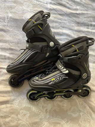 Se venden patines en línea de la marca Fila. - Diseño en color negro con detalles en gris y amarillo. - Cierre de velcro y hebilla. - Ruedas de poliuretano. Usados un par de veces, se venden por desuso