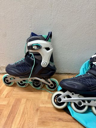 Patines en línea Oxelo, talla 40, en buen estado. - Color negro y turquesa. - Diseño moderno y ligero. - Son ideales para principiantes y personas que buscan un patín cómodo y fácil de usar.