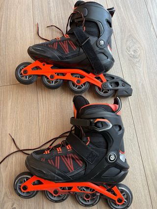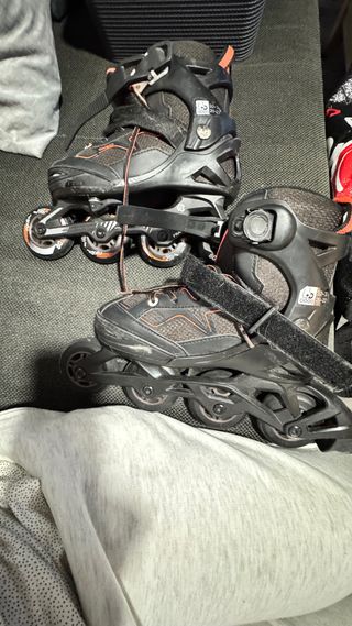 Se venden patines en línea en buen estado, ideales para iniciarse en el patinaje. - Talla ajustable de 30 a 33. - Cierre de velcro y hebilla para mayor seguridad. - Ruedas de 70mm. - Diseño en negro con detalles naranjas.