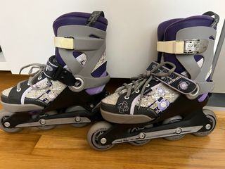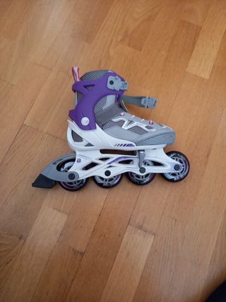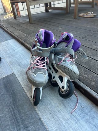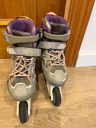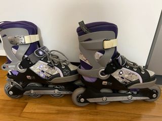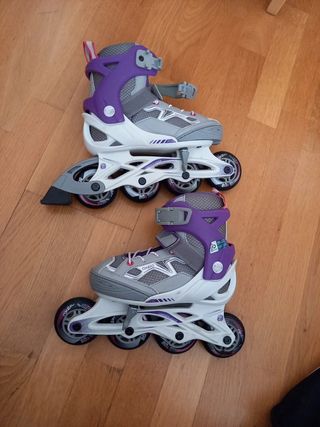 Se venden patines en línea en tonos morado y gris, perfectos para disfrutar del patinaje. Talla 32-35 - Cierre de velcro y cordones. - Ruedas de goma. - Diseño deportivo.