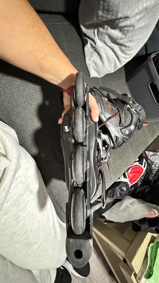 Patines de línea Rollerblade en excelentes condiciones. Apenas usados. - Color negro con detalles rojos y camuflaje. - Sistema de cierre con hebillas y cordones. - Ruedas en perfecto estado.