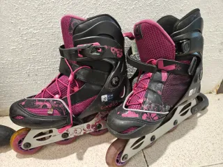 Se venden patines en línea Oxelo en color rosa y negro, talla 37-40. Perfectos para iniciarse en el patinaje. Son dos pares. - Diseño con flores. - Cierre de velcro y cordones. - Ruedas de 70mm.