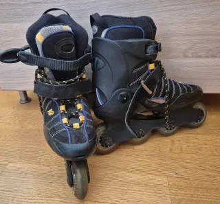 Patines en línea Oxelo con ajuste de talla. - Talla ajustable de 38 a 41. - Diseño en color azul y negro con detalles en amarillo. - Cierre con velcro y hebilla.