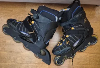 Patines en línea K2 de color negro con detalles en amarillo y azul. - Talla 37. - Cierre de velcro y cordones. - Ruedas de poliuretano.