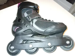 Patines de lienea en color negro y morado, Oxelo, para mujer o chicas , ideales para iniciarse a patinar. En uno de los patines le falta la cinta de ajuste que se adapta al tobillo,se nuestra en la cuarta y quinta foto. Falcil de reponer. Regalo protecciones de coderas y rodilleras. Talla : 37/40 Usados pero totalmente aprobechables.