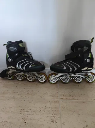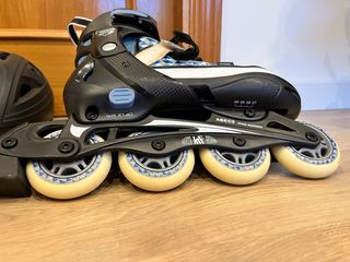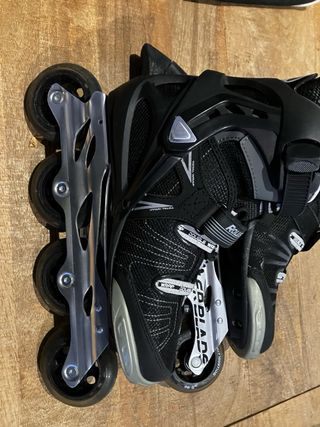 Se venden patines en línea Rollerblade en color negro. Se incluye protecciones y bolsa de transporte. - Cierre de velcro, cordones y cierre automático. - Ruedas de 80mm. - Marco de aluminio sg7