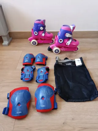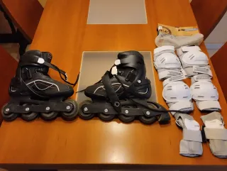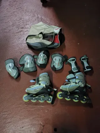 Set completo de patines en línea y equipo de protección, ideal para disfrutar de forma segura. - Incluye patines en línea. - Juego de protecciones para rodillas, codos y muñecas. - Bolsa de transporte incluida.