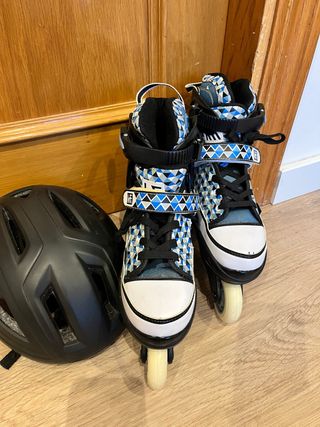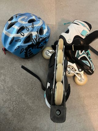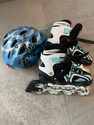 Conjunto de patines en línea y casco protector. - Talla de patines: 35 a 38. - Casco de protección con diseño azul y blanco.