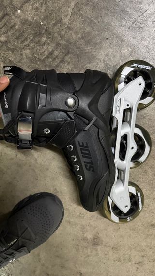 Patines en línea Powerslide SLIDE de color negro. - Bota alta con cierre de carraca y velcro. - Ruedas Powerslide. - Marco de aluminio. talla 42 precio declathron 180€ utilizado 3x de veces. incluye protecciones de mano