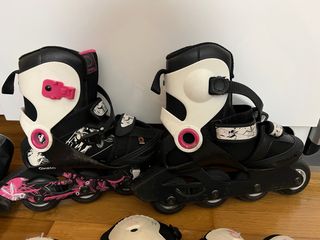 Set de patines en línea Oxelo para tallas 32 a 34. Incluye protectores. Regalo bolsa de transporte Oxelo. - Diseño en color negro, blanco y rosa. - Cierre de velcro y hebilla. - Ruedas de patinaje. - Protectores para rodillas, codis y manos - Bolsa para guardar y transportar.