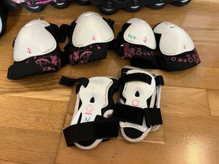 Patinetes en línea Roces ajustables. - Talla 30-33. - Diseño en color negro y rosa con estampado floral. - Cierre de velcro y hebilla. incluida las protecciones ( rodilleras, coderas y proteccion manos). Tambien se incluye bolsa de transporte Roces. Los patines estan en su caja original.