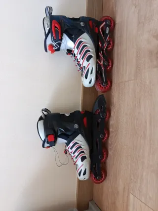 Patines en línea con un diseño moderno y deportivo. - Color principal negro con detalles en blanco y rojo. - Cierre de cordones y hebillas.
