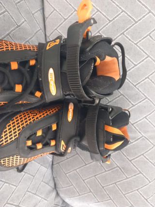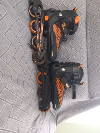 Patines en línea con un diseño moderno en negro y detalles naranjas.usado un par de veces. - Talla 35-38 (22-24 cm). - Cierre con cordones, velcro y hebilla. - Ruedas de 80 mm.