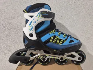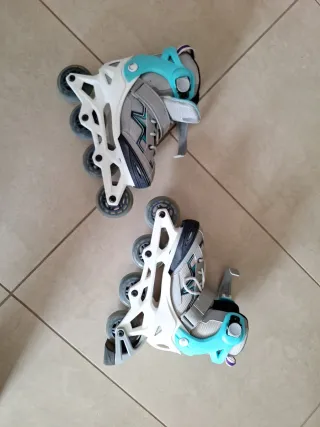 Patines en línea usados, ideales para jóvenes. Se encuentran en buen estado, aunque presentan señales normales de uso. - Talla 35-38 - Color plata con detalles azules. - Sistema de cierre con cordones y correas. - 2 patines incluidos.