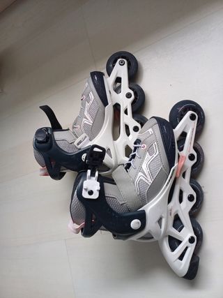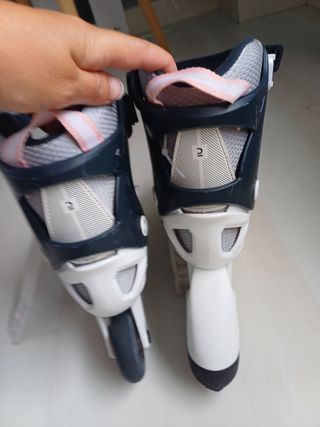 Patines en línea para niña, marca Decathlon, talla 29-32. Están en buen estado y son grises y blancos. - Modelo para niñas. - Marca: Decathlon. - Talla: 29-32.