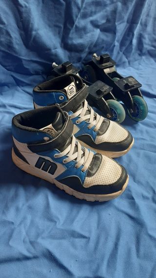 Zapatillas, deportivas TALLA 35. En buen estado, con signos de uso / desgaste (ver fotos). 2 en 1, ya que tiene la posibilidad de enganchar los patines, en las mismas zapatillas. Tiene 4 ruedas (con luces) ,2 traseras y 2 en línea, para facilitar el equilibrio. Se entregan limpias, desinfectadas y rodamientos limpios y engrasados. ❌ No se admiten devoluciones, todo bien detallado en fotos y descripción. Zapatillas deporte, roller patines en línea, todo en uno. Altas tipo bota, zapatilla baloncesto.