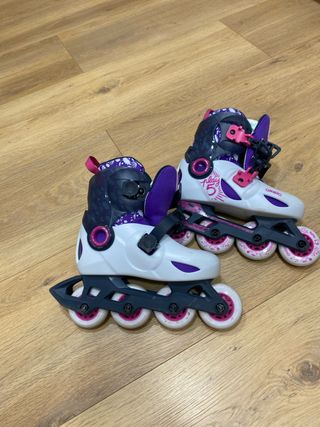 Patines en línea para niñas, en buen estado. Ideales para principiantes. - Color negro y morado. - Talla ajustable. - Incluye dos patines. En persona