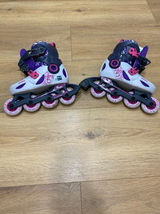 Patines en línea de la marca Oxelo, diseñados para niñas. Son ajustables para adaptarse al crecimiento. - Color blanco, morado y detalles en rosa. - Cierre con velcro y hebilla. - Ruedas con diseño. - Freno trasero.