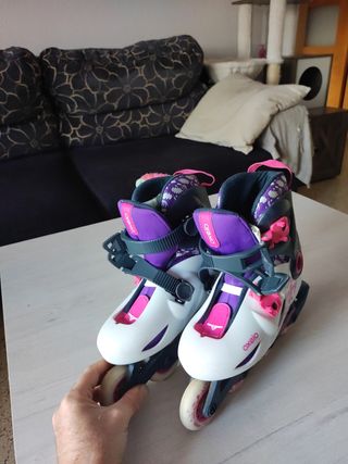 Patines de línea ajustables de la talla 28 a la 30, sin bota. Se usa con los propios zapatos. Marca oxelo del decathlon.