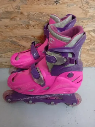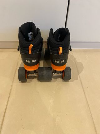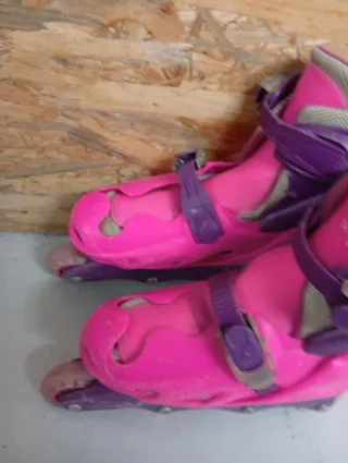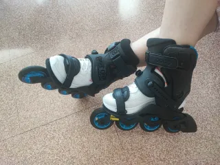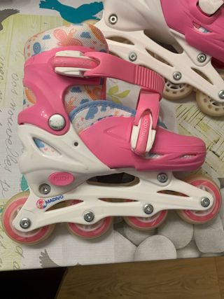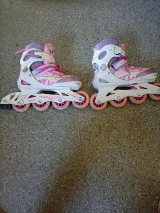 Ajustables las talla de 25 a 28. Tienen señales de uso pero se pueden aprovechar perfectamente para aprender. Se pueden poner en línea o a tres ruedas. No tienen mucho uso