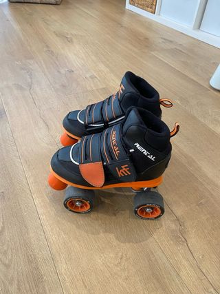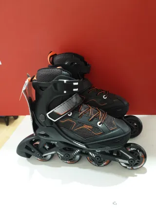 Patines en línea KRF Rental en color negro y naranja, con cierre de velcro para un ajuste seguro. Ideales para iniciarse en el patinaje. - Cierre de velcro. - Talla ajustable 32-33. - Diseño deportivo. - Precio no negociable