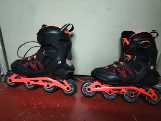 Patines en línea ajustables Decathlon, talla 36-38. Están en buen estado, con algunos signos normales de uso. - Modelo Decathlon. - Talla ajustable 36-38. - Color rojo y gris.