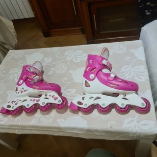 Set de patines en línea para niños, ajustables en talla. Perfectos para iniciarse en el patinaje. - Color rosa y blanco. - Ruedas luminosas. - Cierre de velcro y cordones. Patines con poco uso. Talla ajustable de la 32 a la 35. Casco con isoflix... para ajustar el tamaño de la cabeza, como nuevo. Aproximadamente vale de 5 a 12 años Talla m de 52 a 56 cm