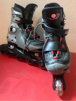 Patines en línea Oxelo, usados pero en buen estado. Ideales para principiantes. - Talla 30-33. - Color negro y rojo. - Cuatro ruedas. Modelo para niños o principiantes. Características: Es un patín con botín semiflexible, suela de espuma para mayor comodidad, y un sistema de ajuste triple (cordones, hebillas y velcro) para una buena sujeción. Ajustable: Este tipo de patín suele ser ajustable en varias tallas, lo que lo hace adecuado para niños en crecimiento.