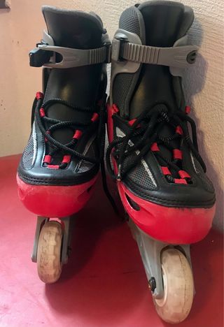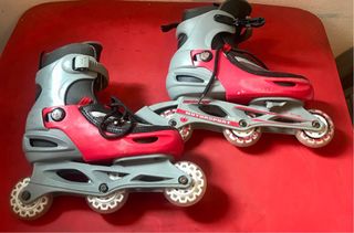 Par de patines en línea en color negro con detalles en rojo. Perfectos para desplazarse y practicar patinaje. - Diseño deportivo. - Cierre de velcro y hebilla. - Ruedas de 76 mm -desgastes reflejados segun el uso se puede apreciar en las fotos